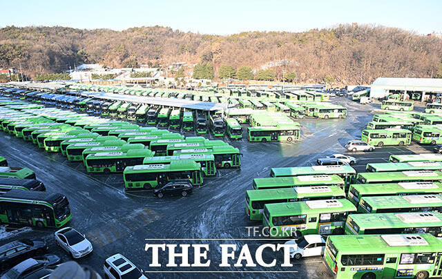 [더팩트ㅣ남용희 기자] 서울 시내버스가 총파업에 돌입한 13일 오전 서울 양천구 공영차고지에 시내버스가 주차돼 있다.