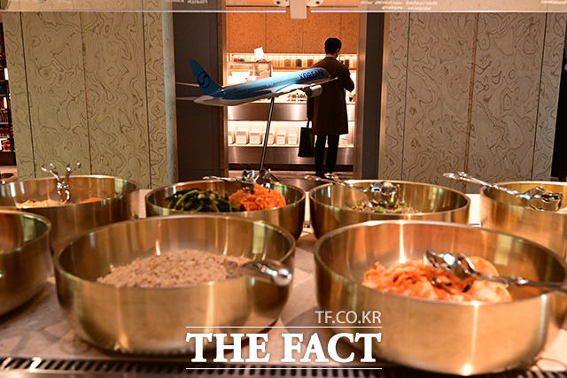[더팩트ㅣ인천국제공항=남윤호 기자] 13일 오전 인천국제공항 제2여객터미널에서 리뉴얼을 마친 대한항공 프레스티지 동편 좌측 라운지가 공개돼 관계자가 마련된 식음료를 살펴보고 있다.