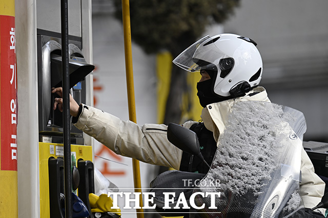 [더팩트 | 송호영 기자] 휘발유와 경유 주간 평균 가격이 하락 중인 19일 오후 서울 강서구의 한 주유소에서 한 시민이 주유를 하고 있다.