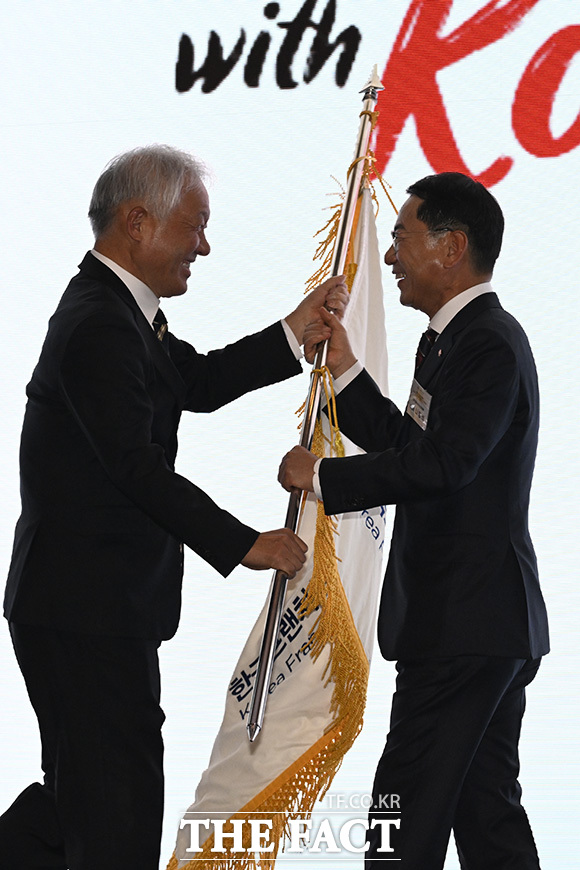 [더팩트 | 송호영 기자] 정현식 한국프랜차이즈산업협회 전임 협회장(왼쪽)이 19일 오후 서울 영등포구 콘래드 서울에서 열린 한국프랜차이즈산업협회장 이취임식에 참석해 나명석 신임 협회장에게 협회기를 이양하고 있다.