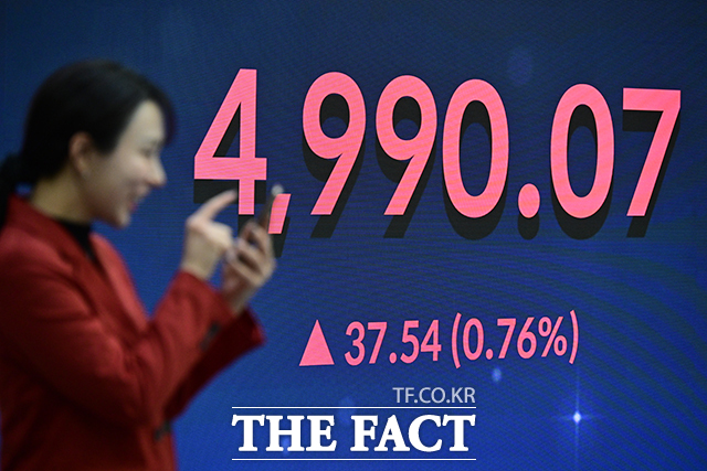 [더팩트ㅣ남윤호 기자] 23일 서울 여의도 한국거래소 전광판에 코스피 종가 지수가 4,990.07로 표시되고 있다.