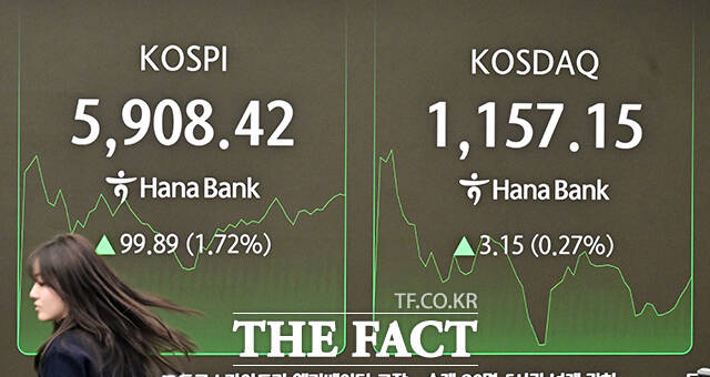 [더팩트ㅣ임영무 기자] 미 연방대법원이 도널드 트럼프 대통령의 상호관세 정책에 제동을 건 가운데 23일 오전 서울 중구 하나은행 딜리룸 현황판에 코스피가 99.89 포인트 오른 5908.42를 기록하고 있다. 코스피는 전장 대비 94.58포인트(1.63%) 높은 5903.11로 출발해 장중 한때 5931.86까지 치솟으며 역대 최고치를 새로 썼다.