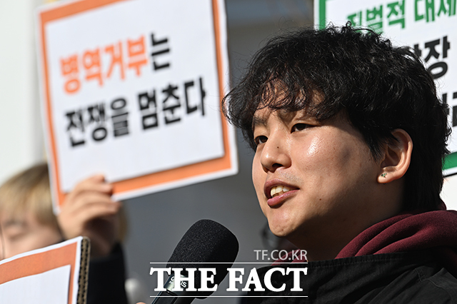 [더팩트ㅣ박헌우 기자] 평화활동가 김민형(두부) 씨가 23일 오전 서울 여의도 국회 앞에서 열린 '평화활동가 두부 병역거부 선언 기자회견'에 참석해 병역거부 선언을 하고 있다.