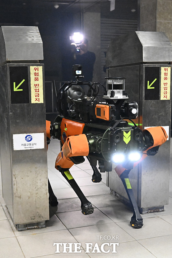 [더팩트 | 송호영 기자] 서울소방재난본부가 26일 오후 서울 은평구 서울소방학교 지하철훈련장에서 개최한 '미래형 재난대응 체계' 공개 시연 행사에서 사족보행 로봇이 구조 활동을 하고 있다.
