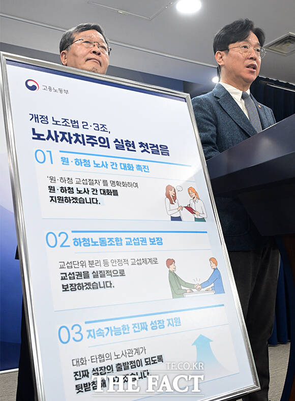 [더팩트ㅣ임영무 기자] 김영훈 고용노동부 장관(오른쪽)이 27일 오전 서울 종로구 정부서울청사에서 중앙노동위원회와 공동으로 노조법 2·3조 현장 안착을 위한 브리핑을 하고 있다.