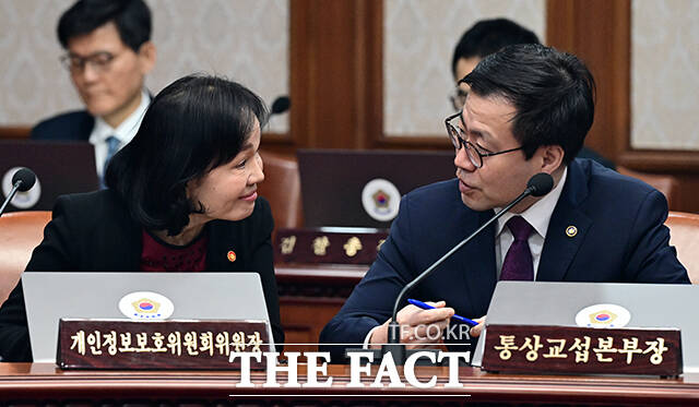 [더팩트ㅣ임영무 기자] 송경희 개인정보보호위원장(왼쪽)이 3일 오전 서울 종로구 정부서울청사에서 열린 국무회의에 참석해 여한구 통상교섭본부장과 대화를 나누고 있다.