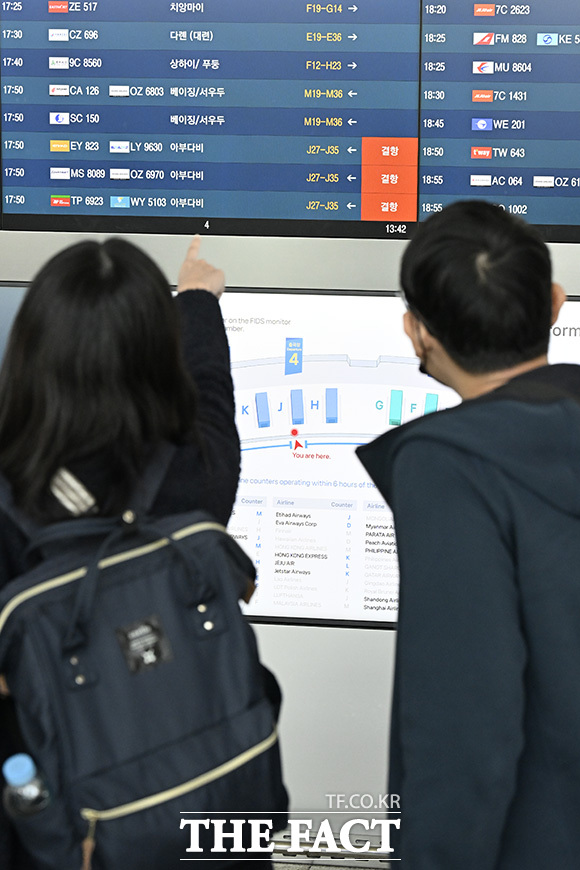 [더팩트 | 인천국제공항=송호영 기자] 미국과 이스라엘의 공습으로 이란 최고지도자 알리 하메네이가 사망하는 등 중동 지역의 긴장이 고조되는 가운데 3일 오후 인천국제공항 전광판에 아랍에미리트(UAE) 아부다비행 항공편 결항 안내가 표시되고 있다.