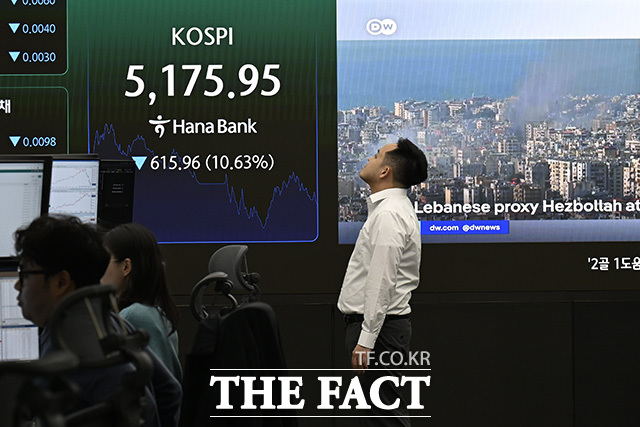 [더팩트 | 송호영 기자] 미국과 이스라엘의 이란 공습으로 중동 지역 정세가 악화하는 가운데 4일 오후 서울 중구 하나은행 본점 딜링룸 전광판에 코스피 지수가 표시되고 있다.