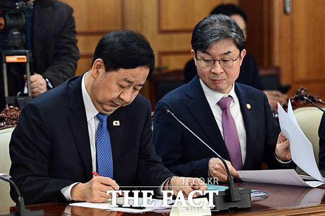 [더팩트ㅣ임영무 기자] 구윤철 부총리 겸 재정경제부 장관(왼쪽)이 4일 오후 서울 종로구 정부서울청사에서 열린 중동 상황점검 긴급 관계부처 회의에 참석해 회의 자료를 살펴보고 있다.