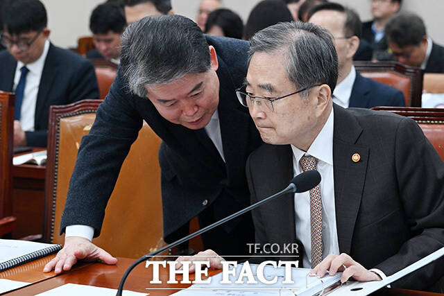 [더팩트ㅣ국회=남용희 기자] 조현 외교부 장관(오른쪽)과 김경협 재외동포청장이 6일 오전 서울 여의도 국회에서 열린 외교통일위원회 전체회의에 참석해 대화를 나누고 있다.