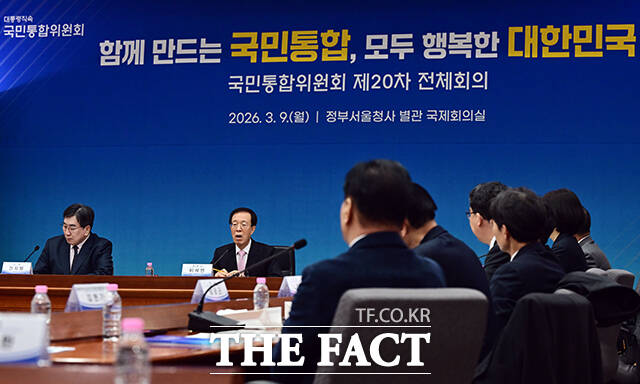 [더팩트ㅣ임영무 기자] 이석연 국민통합위원장(왼쪽 두 번째)이 9일 오전 서울 종로구 정부서울청사 별관에서 열린 20차 전체회의에 참석해 인사말을 하고 있다.