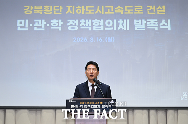 [더팩트ㅣ박헌우 기자] 오세훈 서울시장이 16일 오전 서울 중구 서울시청에서 열린 '강북횡단지하고속도로 건설 정책협의회 발족식'에 참석해 인사말을 하고 있다.