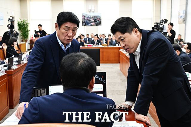 [더팩트 | 국회=배정한 기자] 강대식 국방위 야당 간사와 성일종 국방위원장, 부승찬 여당 간사(왼쪽부터)가 17일 오후 서울 여의도 국회에서 열린 국방위원회 전체회의에 참석해 대화를 하고 있다.