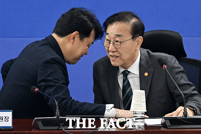 [더팩트ㅣ국회=남용희 기자] 김윤덕 국토교통부 장관(오른쪽)과 복기왕 의원이 18일 오전 서울 여의도 국회 의원회관에서 열린 더불어민주당 국토교통위원회-국토교통부 당정협의에 참석해 대화를 나누고 있다.