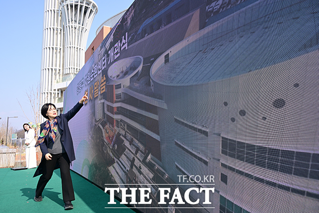 [더팩트ㅣ남윤호 기자] 이수희 강동구청장이 20일 오후 서울 강동구 자원순환센터 개관식에 참석해 인사말을 하며 옥상 공연장을 설명하고 있다.