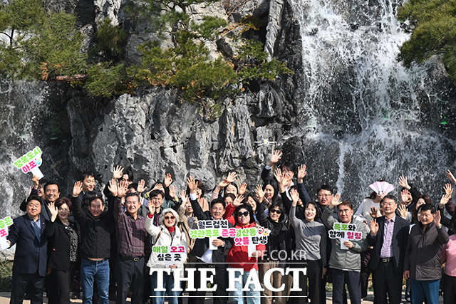 [더팩트ㅣ남윤호 기자] 박강수 마포구청장과 구민들이 24일 오후 서울 마포구 월드컵천에 새로 조성된 경관폭포에서 기념촬영을 하고 있다.