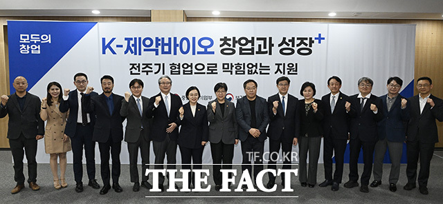 [더팩트 | 송호영 기자] 한성숙 중소벤처기업부 장관(왼쪽 일곱 번째)과 정은경 보건복지부장관(왼쪽 여덟 번째), 제약바이오 업계 종사자들이 24일 오후 서울 서초구 한국제약바이오협회에서 열린 'K-제약바이오 창업과 성장-전주기 협업으로 막힘없는 지원 간담회'에 참석해 기념사진을 촬영하고 있다.
