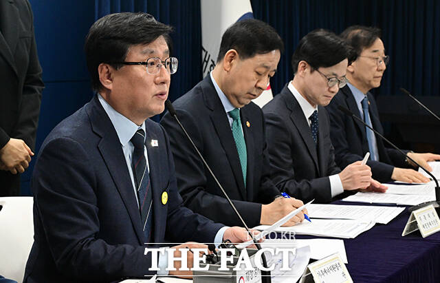 [더팩트ㅣ임영무 기자] 김성환 기후에너지환경부 장관(왼쪽)이 26일 오전 서울 종로구 정부서울청사에서 중동 전쟁에 따른 비상경제 대응방안을 설명하고 있다.