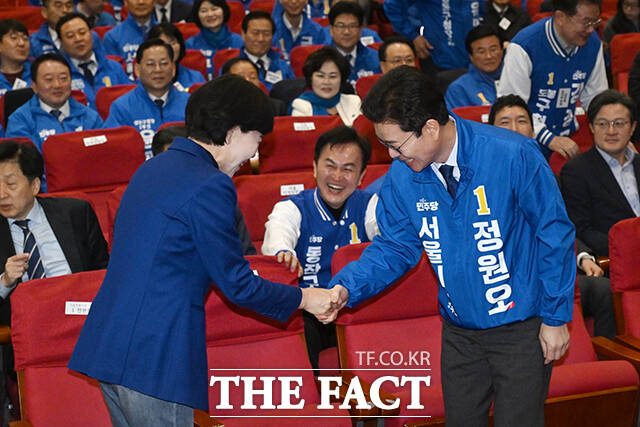 [더팩트ㅣ국회=서예원 기자] 전현희(왼쪽)·정원오 더불어민주당 서울시장 예비 후보가 30일 오전 서울 여의도 국회 의원회관에서 열린 서울 현장 최고위원회의에서 인사를 나누고 있다.