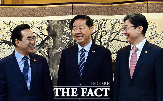 [더팩트ㅣ임영무 기자] 박홍근 기획예산처 장관, 구윤철 부총리 겸 재정경제부 장관, 이억원 금융위원장(왼쪽부터)이 1일 오전 서울 종로구 정부서울청사에서 열린 거시재정금융간담회에 참석해 대화를 나누고 있다.