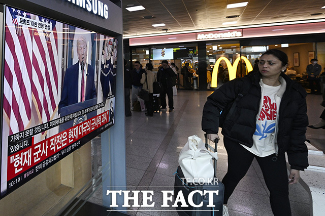 [더팩트 | 송호영 기자] 도널드 트럼프 미국 대통령이 이란 전쟁 관련 대국민 연설을 한 2일 오전 서울 중구 서울역의 한 외국인 관광객이 방송 화면을 바라보고 있다.