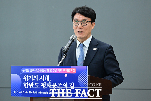 [더팩트ㅣ남윤호 기자] 김민석 국무총리가 2일 서울 종로구 서울글로벌센터에서 열린 문익환 방북-4.2공동성명 37주년 기념 국제토론회 '위기의 시대, 한반도 평화공존의 길'에 참석해 축사하고 있다.