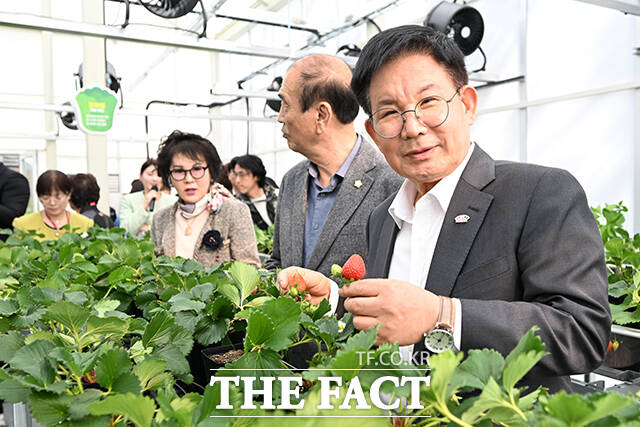 [더팩트ㅣ서예원 기자] 박강수 마포구청장이 2일 오후 서울 마포구 망원1-2공영주차장 지상부에 조성된 ‘마포 스마트팜 체험관’ 준공식에 참석해 스마트 온실을 둘러보고 있다.