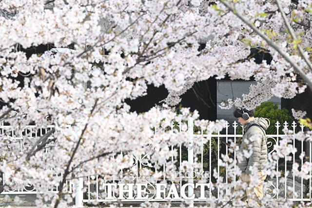 [더팩트 | 김성렬 기자] 완연한 봄날씨를 보인 3일 오전 서울 마포구 토정로에서 한 시민이 만개한 벚꽃 사이를 지나고 있다.