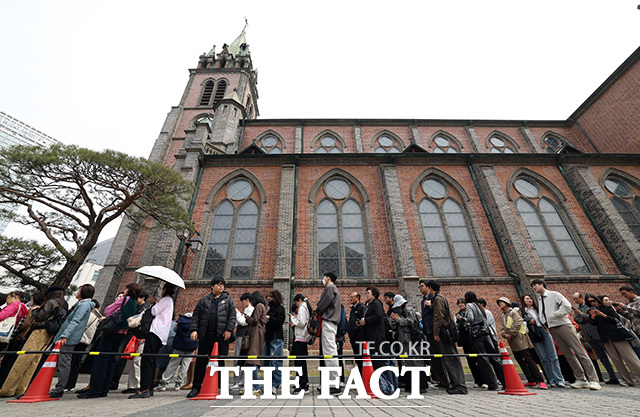 [더팩트 | 사진공동취재단] 부활절인 5일 주교좌 명동대성당에서 열린 '주님 부활절 대축일 미사'에 참석하기 위해 신자들이 길게 줄을 서고 있다.