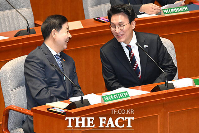 [더팩트ㅣ국회=남용희 기자] 구윤철 부총리 겸 재정경제부 장관(왼쪽)과 김민석 국무총리가 7일 오전 서울 여의도 국회에서 열린 예산결산특별위원회 전체회의에서 대화를 나누고 있다.