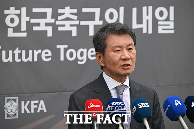 [더팩트ㅣ천안=남윤호 기자] 정몽규 대한축구협회장이 7일 천안 서북면 코리아풋볼파크 개관식에 앞서 취재진에게 개관 소감을 말하고 있다.