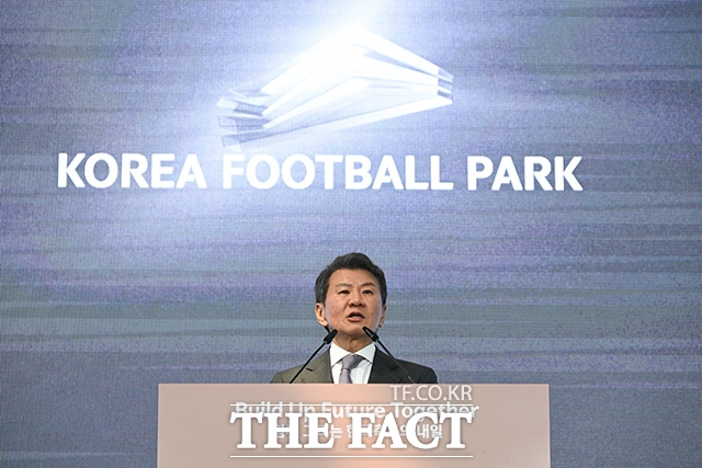 [더팩트ㅣ천안=남윤호 기자] 정몽규 대한축구협회장이 7일 천안 서북면 코리아풋볼파크 실내 축구장에서 열린 개관식에서 기념사를 하고 있다.