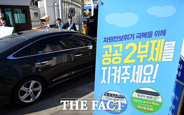 [더팩트ㅣ임영무 기자] 정부의 에너지 수요 강화를 위한 공공기관 승용차 2부제가 시행된 8일 오전 서울 종로구 정부서울청사 입구에는 2부제를 알리는 캠페인이 진행되고 있다.