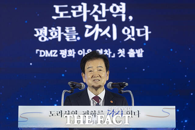 [더팩트ㅣ임영무 기자] 정동영 통일부 장관이 10일 오전 경기도 파주 도라산역에서 열린 '도라산역 평화를 다시 잇다'행사에 참석해 기념사를 하고 있다.