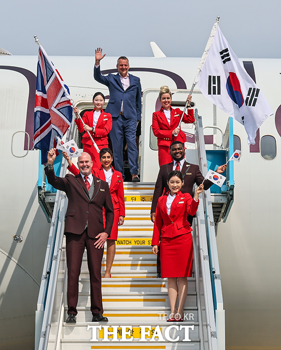 [더팩트ㅣ공항사진기자단] 14일 오전 인천국제공항 제2여객터미널주기장에 도착한 영국 버진애틀랜틱의 런던 히드로발 항공기에서 최고경영자 코닐 코스터(맨 위)와 승무원들이 취항을 기념하며 인사하고 있다.