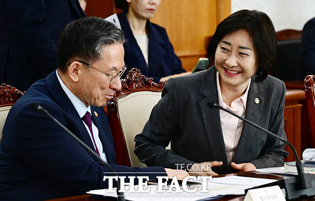 [더팩트ㅣ임영무 기자] 정성호 법무부 장관(왼쪽)과 이스란 보건복지부 1차관이 14일 오후 서울 종로구 정부서울청사에서 열린 공명선거 관계장관회의에 참석해 대화를 나누고 있다.
