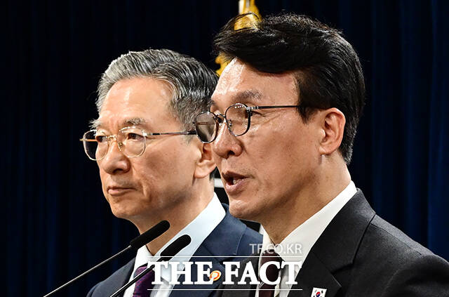 [더팩트ㅣ임영무 기자] 김민석 국무총리(오른쪽)가 14일 오후 서울 종로구 정부서울청사에서 제9회 동시지방선거 관련 대국민담화를 하고 있다.