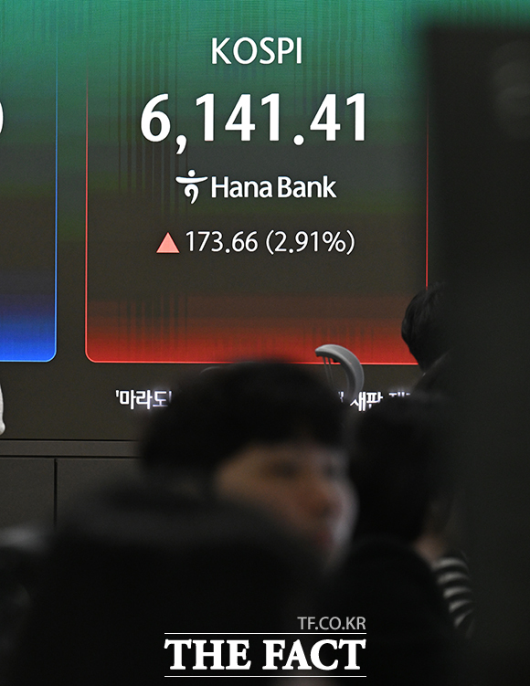 이날 코스피는 전 거래일(5967.75) 대비 2.91%(173.85포인트) 오른 6141.60 출발했다. 원·달러 환율은 전거래일보다 10.2원 하락한 1471.0원에 출발했다.