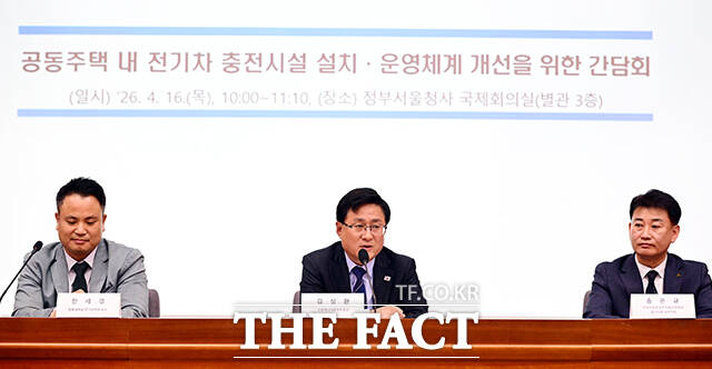 [더팩트ㅣ임영무 기자] 김성환 기후에너지환경부 장관(가운데)이 16일 오전 서울 종로구 정부서울청사 별관에서 열린 공동주택 내 전기차 충전시설 설치·운영체계 개선을 위한 간담회에 참석해 모두발언을 하고 있다.