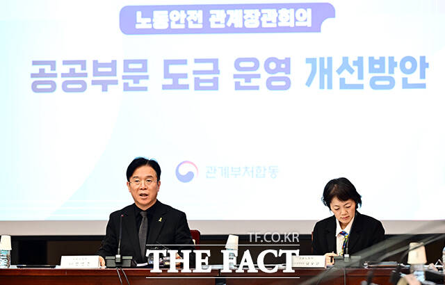 [더팩트ㅣ임영무 기자] 김영훈 고용노동부 장관(왼쪽)이 16일 오전 서울 종로구 정부서울청사에서 열린 노동안전 관계장관회의에 참석해 모두발언을 하고 있다.