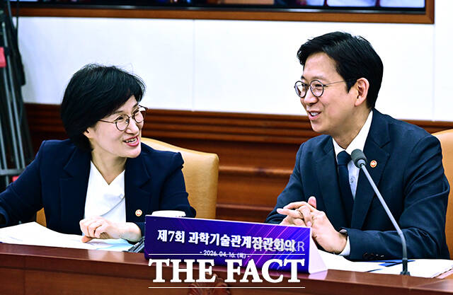 [더팩트ㅣ임영무 기자] 배경훈 부총리 겸 과학기술정보통신부 장관(오른쪽)이 16일 오후 서울 종로구 정부서울청사에서 열린 과학기술관계장관회의에 참석해 원민경 성평등가족부 장관과 대화를 나누고 있다.