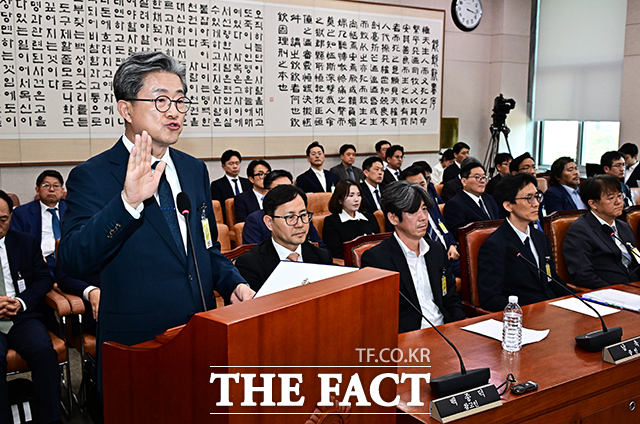 [더팩트 | 국회=배정한 기자] 정순욱 전 경기도지사 비서실장이 16일 오후 서울 여의도 국회에서 열린 윤석열 정권 정치검찰 조작기소 의혹 사건 진상규명 국정조사특별위원회 대장동·김용 전 민주연구원 부원장·위례신도시 조작기소 의혹 사건 청문회에 출석해 증인선서를 하고 있다.
