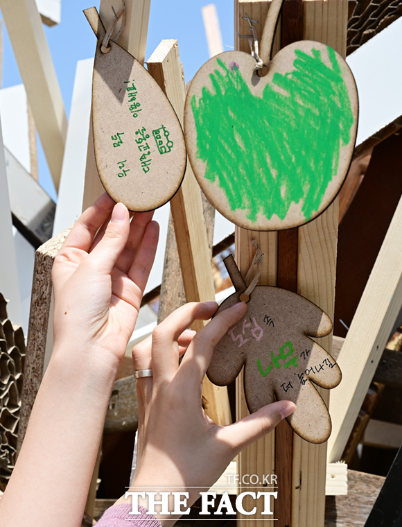 [더팩트ㅣ이새롬 기자] 18일 서울 광화문 광장에서 서울시와 녹색서울시민위원회 주최로 '2026 지구의 날 기념행사'가 열린 가운데, 행사를 찾은 시민들이 폐나무로 만든 소망나무를 살피고 있다.