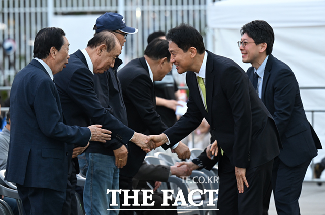 [더팩트ㅣ이새롬 기자] 오세훈 서울시장이 18일 오후 서울 광화문광장 육조마당에서 열린 4·19혁명 66주년 서울시 기념행사에 참석해 참석자들과 인사하고 있다.