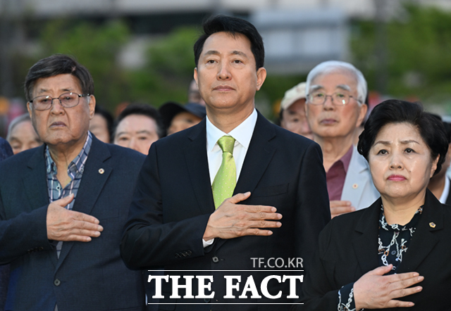 [더팩트ㅣ이새롬 기자] 오세훈 서울시장이 18일 오후 서울 광화문광장 육조마당에서 열린 4·19혁명 66주년 서울시 기념행사에 참석해 국민의례를 하고 있다.