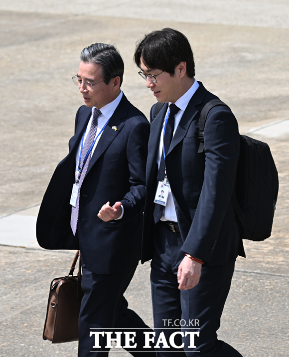 [더팩트ㅣ서울공항=이새롬 기자] 인도·베트남 국빈방문 순방길에 나선 이재명 대통령과 동행 수행하는 김용범 정책실장과 하정우 AI미래기획수석이 19일 경기 성남시 서울공항에서 공군 1호기로 이동하고 있다.