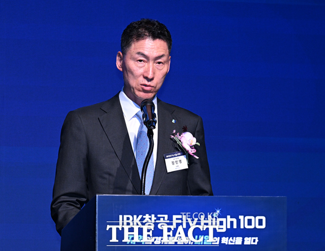 [더팩트ㅣ이새롬 기자] 장민영 IBK기업은행장이 20일 서울 강남구 그랜드 인터컨티넨탈 서울 파르나스에서 열린 'IBK창공 플라이하이 100' 개막식에 참석해 환영사를 하고 있다.