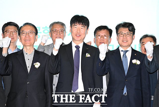[더팩트ㅣ박헌우 기자] 박재희 한국공항공사 사장직무대행(가운데)과 진성준 더불어민주당 의원(오른쪽) 등 참석자들이 21일 오후 서울 강서구 KAC 항공훈련센터 SIM HALL에서 열린 B737-8(Max) 모의비행장치 도입 기념행사에 참석해 기념촬영을 하고 있다.