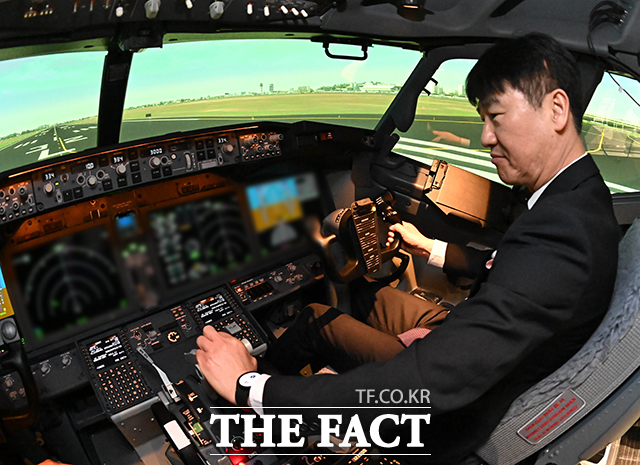 [더팩트ㅣ박헌우 기자] 박재희 한국공항공사 사장직무대행이 21일 오후 서울 강서구 KAC항공훈련센터 SIM HALL에서 열린 B737-8(Max) 모의비행장치 도입 기념행사에 참석해 모의비행장치를 체험하고 있다.