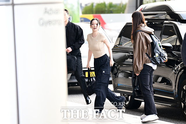 [더팩트ㅣ김포국제공항=남윤호 기자] 에스파 카리나(가운데)가 23일 오전 서울 강서구 김포국제공항에서 중국 상하이 출국을 앞두고 취재진과 팬들에게 포즈를 취하고 있다.